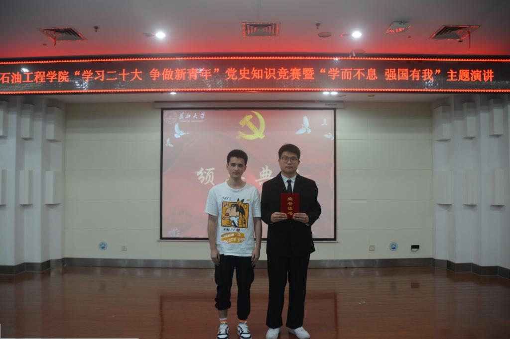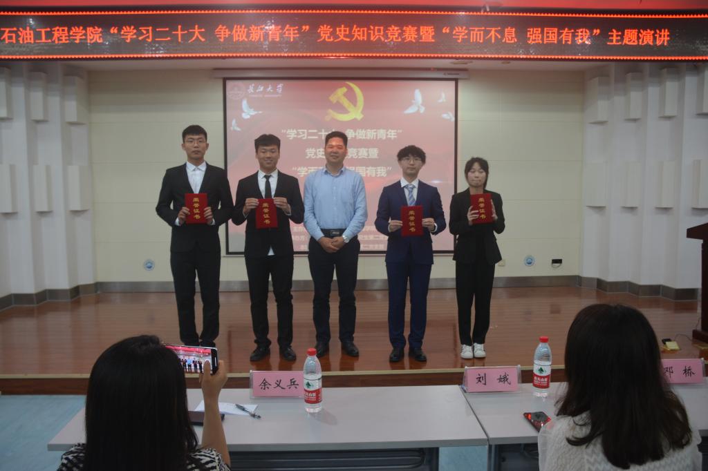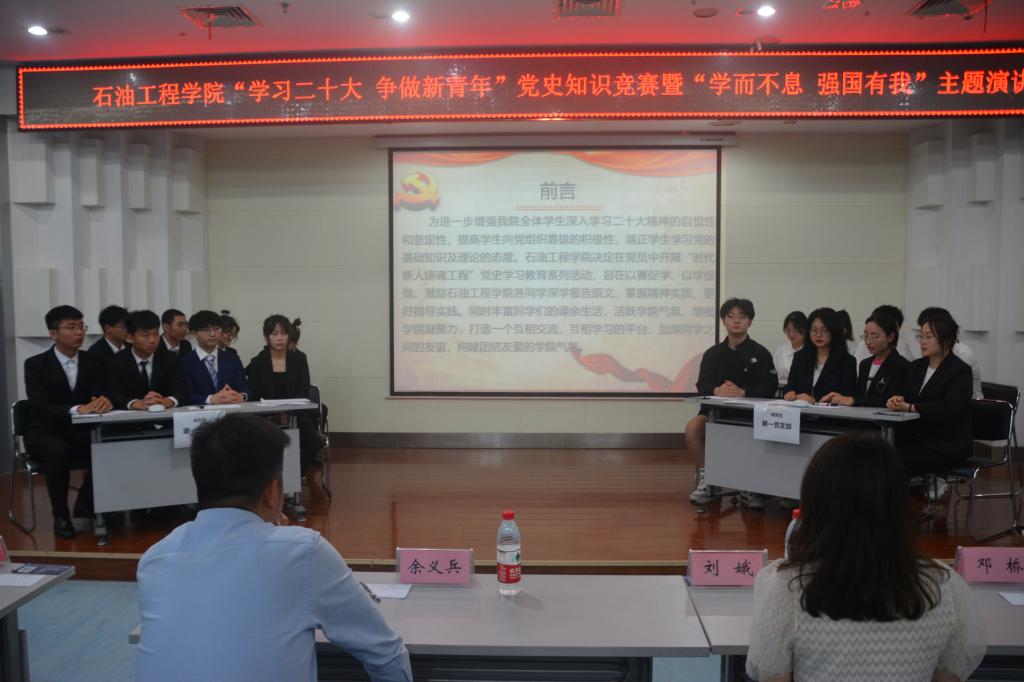 (通讯员 王雪瑶/文 刘科技 刘昕竹/文)2023年04月20日18:00,betway必威于图书馆报告厅顺利开展“学习二十大 争做新青年”党史知识竞赛暨“学而不息 强国有我”主题演讲活动。公司党委副书记刘娥、油气井工程系教工党支部邓桥、余义兵,学工办史永波、郭冀宁、周晓峰、陈金建老师莅临本次比赛现场。