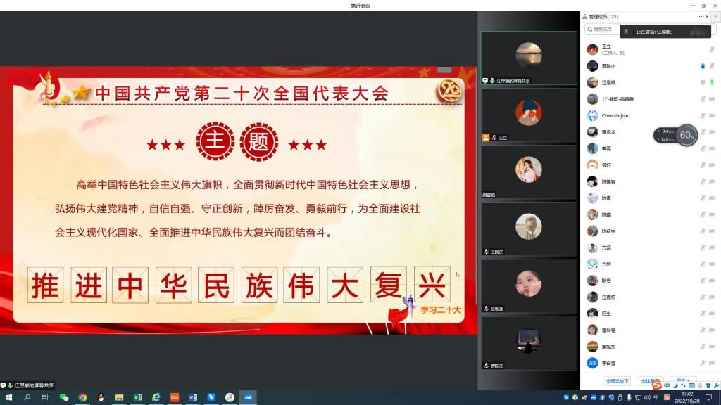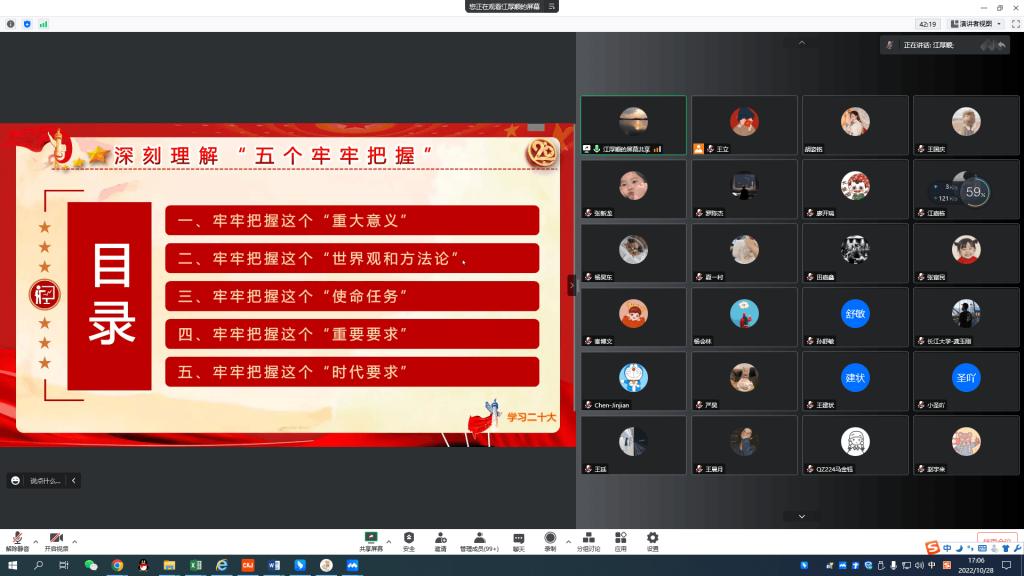 (通讯员 盛钲钦)10月28日下午4时,学院经理江厚顺在腾讯会议平台讲授“学习贯彻党的二十大精神,深刻理解‘五个牢牢把握’”形势与政策专题党课,研究生党支部书记郭冀宁、王立和全体研究生党员同志参加。