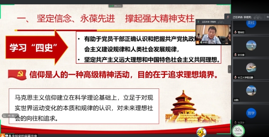 6月23日下午,学院在石油科技大楼B113室召开全院教职工大会,经理江厚顺以“学习‘四史’ 汲取智慧”为题为全院教职工了讲授了一堂形势与政策课,在外出差教师在腾讯会议平台线上同步学习。
