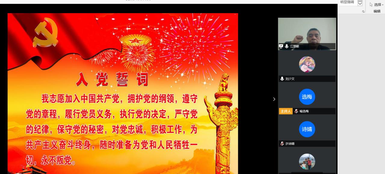 会上,疫情特殊时期,面对电子屏幕上的党旗,全体党员面对党旗,紧握右拳,庄严重温入党誓词。