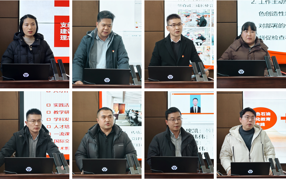全国党建工作样板支部、油气田开发工程系教工党支部书记许文俊展示了校外党建联建共创活动、“三位一体”党团共建机制和“三全育人”实践成果;油气储运工程系教工党支部书记边江详细介绍了支部“我为师生办实事”实践活动开展过程和成果,切实将党建成果切实转化为育人实效;油气井工程系师生联合党支部书记余义兵汇报了支部标准化规范化建设以及支部党建引领系所教学创新和科学研究情况;机关教工党支部书记杨小玉重点汇报了“党员示范岗”品牌活动开展实效,以及机关党建与“学院目标考核管理办法”等业务工作融合特色。油气田化学工程系教工党支部书记孙珊珊、海工系和实验中心联合教工党支部书记徐鹏、新能源科学与工程系教工党支部书记汪维伟、员工党支部书记代表韩清越分别围绕支部政治建设、组织建设、党员教育管理、服务师生群众、推动中心工作融合等核心职责进行了汇报。