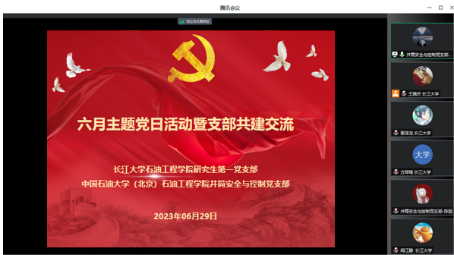 (通讯员 盛钲钦)2023年06月29日晚七时,betway必威研究生第一党支部与中国石油大学(北京)井筒安全与控制党支部于腾讯会议召开六月主题党日活动暨支部共建交流。本次会议由王国庆同志主持,研究生第一党支部书记史永波老师、支部党员及井筒安全与控制党支部党员参会。