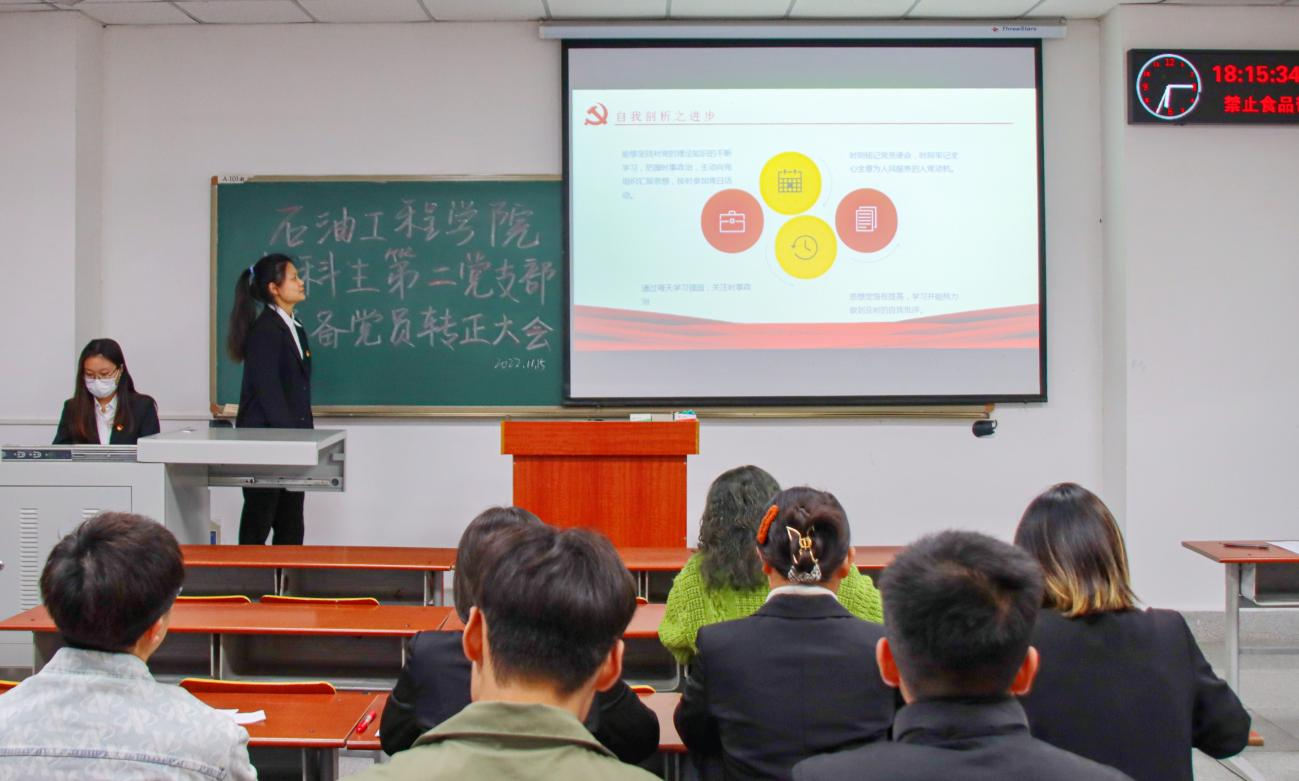 (通讯员 谢晓敏)2022年11月15日下午6时,betway必威2022年下半年员工党员转正大会于武教A101如期举行,本次会议由张雨锡、杨心如两位同志主持,会议讨论了关于杨丽等8名同志申请转为正式党员的问题。