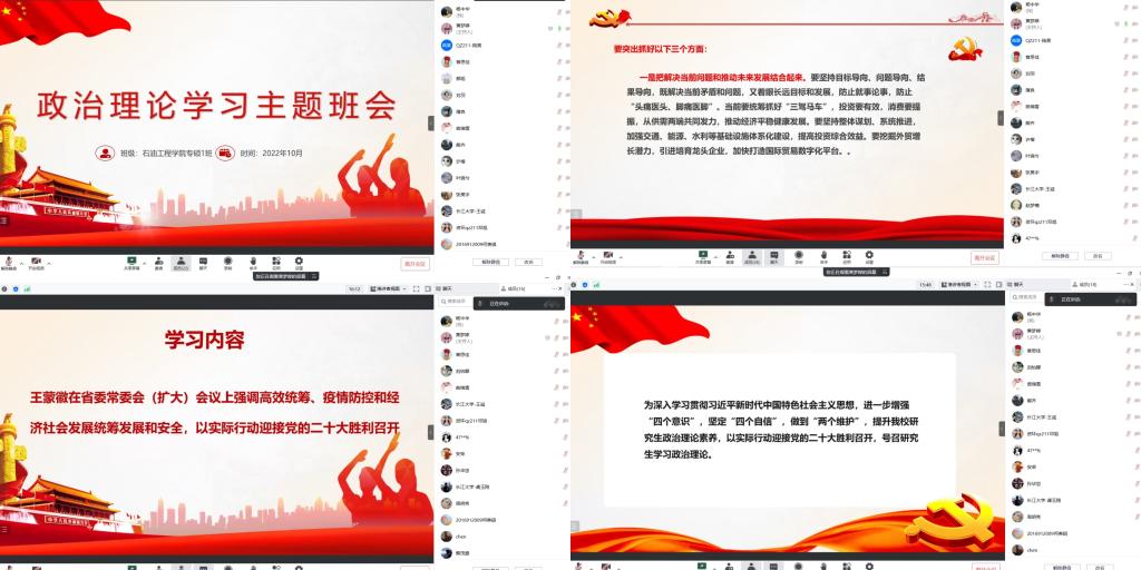 各班采取腾讯会议的形式,学习的主要内容包括:习近平总书记在中国共产党第二十次全国代表大会上所作的报告和发表的重要讲话精神;《习近平谈治国理政》第四卷及习近平总书记“7·26”讲话精神宣讲视频;“深入学习贯彻习近平总书记考察湖北重要讲话精神,推进落实省第十二次党代会决策部署”专题辅导;中国共产党第十九届中央委员会第七次全体会议及中国共产党第十九届中央纪律检查委员会第七次全体会议精神;王蒙徽在省委常委会(扩大)会议上强调高效统筹、疫情防控和经济社会发展统筹发展和安全,以实际行动迎接党的二十大胜利召开。