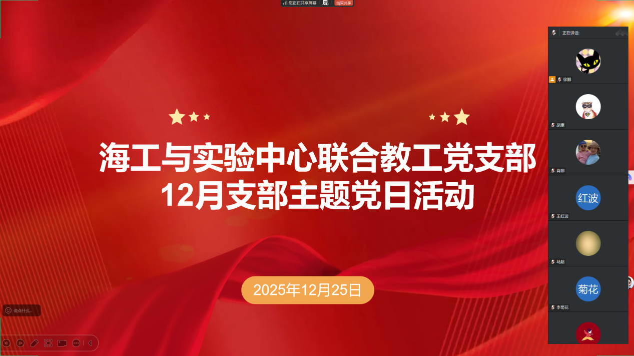 为持续深入学习宣传贯彻党的二十届四中全会精神,切实把思想和行动统一到党中央决策部署、省委工作要求和学校发展规划上来,2025年12月25日,海工与实验中心联合教工党支部以腾讯会议形式召开12月支部主题党日活动。全体教工党员线上参会,活动由党支部书记徐鹏主持。