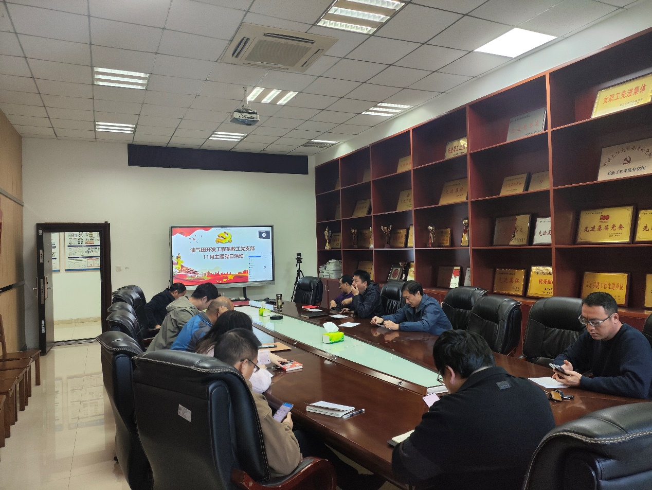 11月28日下午,油气田开发工程系教工党支部在石油科技大楼B113会议室开展11月主题党日活动,主题为“深入学习贯彻党的二十届四中全会精神”。活动由党支部书记许文俊同志主持,全体教工党员参加。