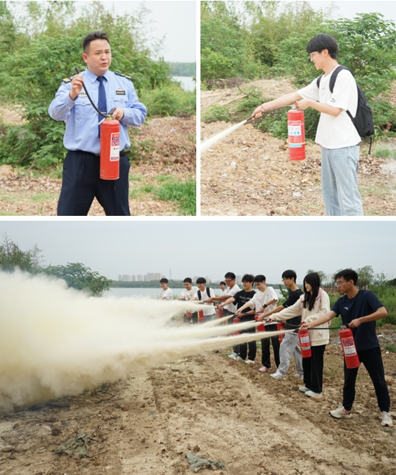 讲座结束后,师生们转移到户外开展灭火器使用的实战操作演练。“一提、二拔、三握、四压!”师生们轮番上阵,化身“消防员”,在黄教官的指导下,按照规范步骤使用干粉灭火器成功扑灭模拟火源,亲身实践了初期火灾扑救的实战技巧,有效提升了应急处置能力。