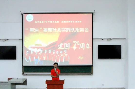 中秋节的假期给新生的军训增添了亮丽的一笔,上午的拉练也圆满结束。下午,新生同学们便来到了教学楼B102,倾听学长学姐们的分享。就坐完毕后,新生辅导员刘少文老师主持并宣布大会开始。刘老师讲到:“此次克拉玛依之行,我们见识了许多,获益匪浅,希望借助这次大会的机会让大家对石油行业有更深的一些了解。”社会实践小分队队长陈金建紧接刘老师的话音,接过话筒展开了他的演讲。陈金建从社会实践的前期招人讲起,再经过一系列的准备--收集信息、准备资料、规划路线、前期写稿……之后,实践活动正式展开。他讲到:此次克拉玛依之行并不容易,几十个小时的火车、一顿顿的泡面、辗转的夜晚,等等。过程虽然比较辛苦,但正是这样的辛苦才让我们的实践活动变得更加有意义。随后,他介绍了新疆之旅到达的地点和参观的流程以及对新疆的看法,让新生同学们对新疆及其石油产业有了初步的了解,台下同学也是被精彩的讲述深深吸引。