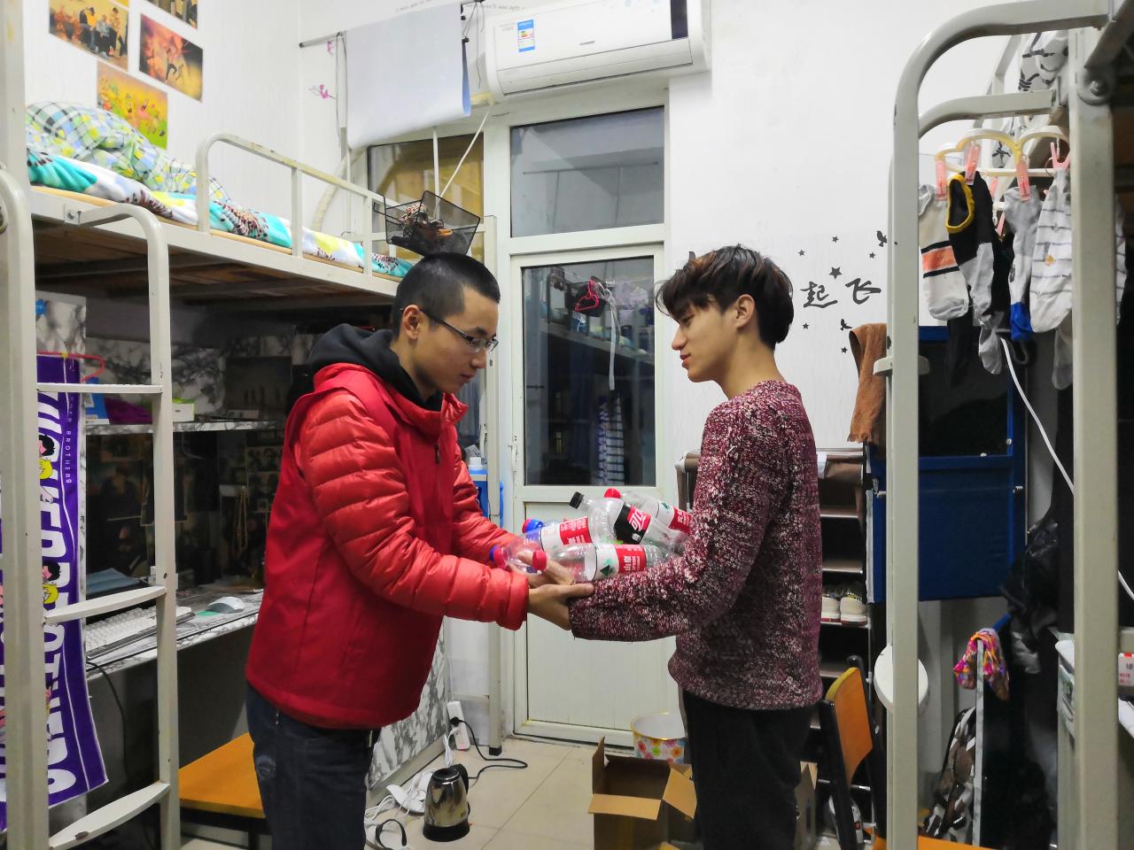首先,志愿者负责人提前来到集合场地,等待其他志愿者到来。,活动开始前经过简单的讨论分工,确定两人为一小组。各组明确所要负责的寝室后,正式开始了本次废品回收活动。