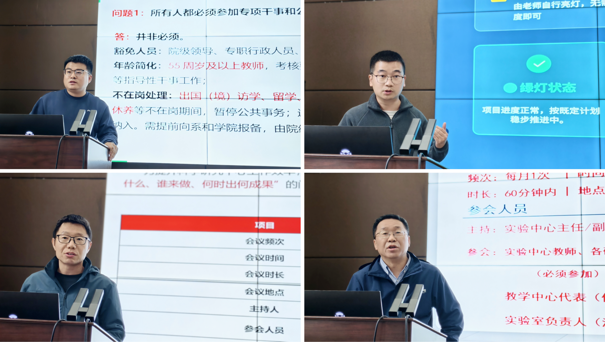 随后四位中心主任分别就改革方案中的关键执行环节作了专题解读。教学运行中心主任张兴凯重点讲解了“公共事务共理”机制的背景、注意事项与“十问十答”,强调公共事务是维系学院大家庭的温暖纽带,旨在实现“找得到人、办得成事”。教学研究中心副主任刘凯、科学研究中心主任陈立峰、实验中心主任马超分别介绍了中心“三级会议”协同管理流程,旨在通过标准化、可视化的过程管理,将核心目标任务转化为可执行、可跟踪、可验收的具体行动。