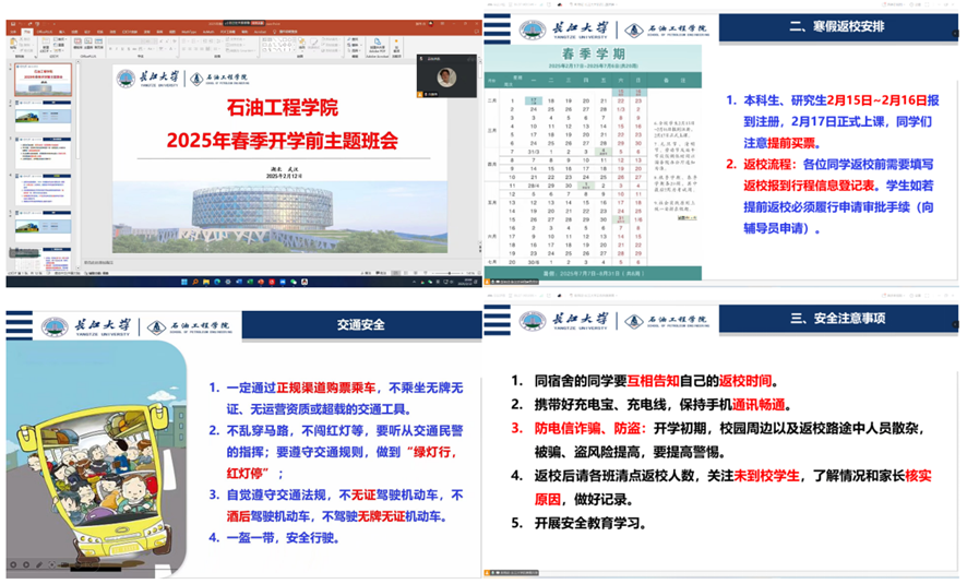 (通讯员 洪一帆)新学期伊始,为切实保障员工平安、有序返校,进一步强化员工的安全责任意识,2025年2月12日,全院研究生以班级为单位,通过线上会议形式召开“安全返校,平安启程”主题安全教育班会。