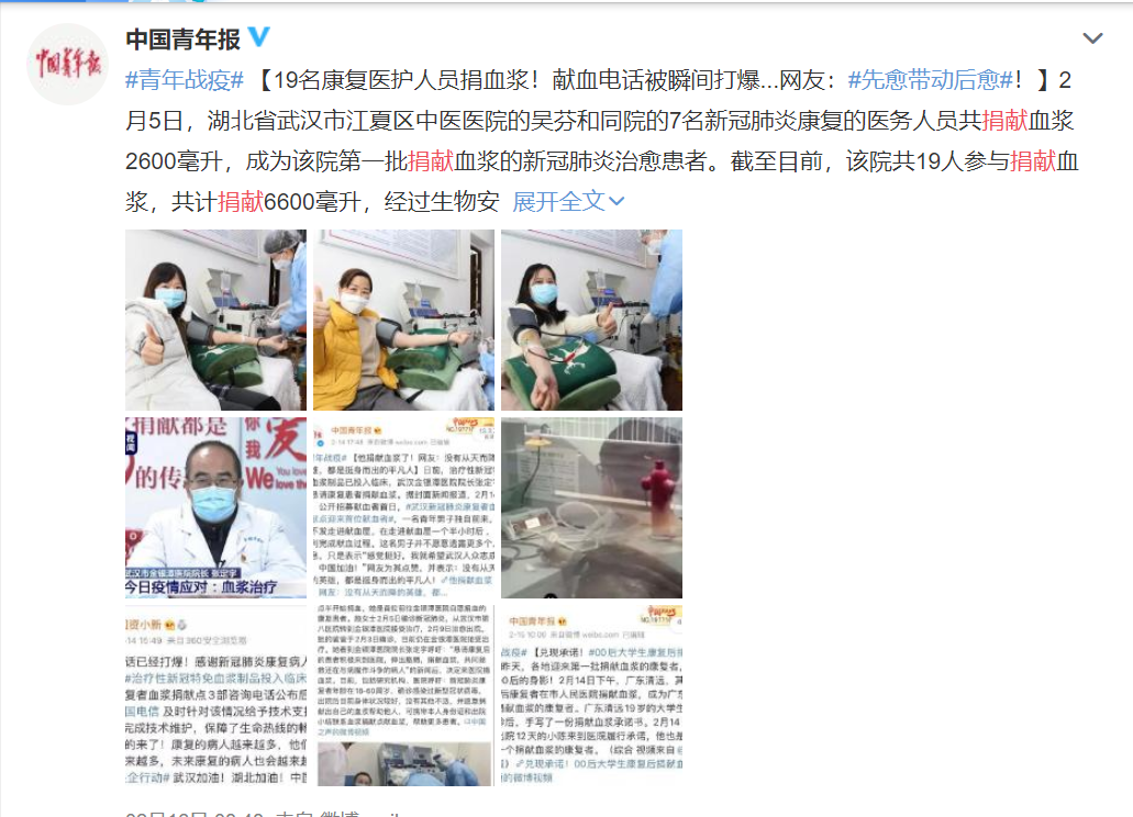 19名康复医护人员捐血浆