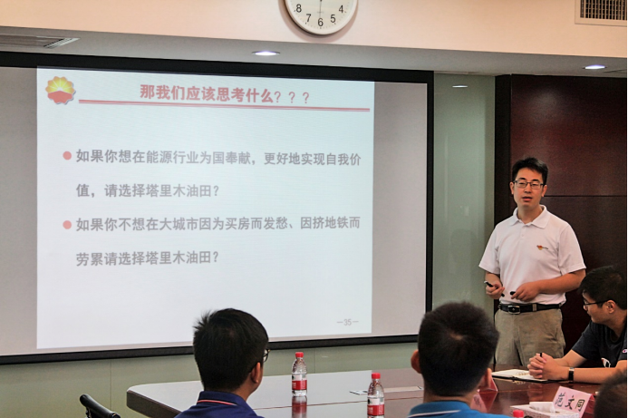 图为塔里木油田油气工程研究院办公室副主任曹立虎向青年提出青年应对未来作出思考。通讯员 赵书逸 摄